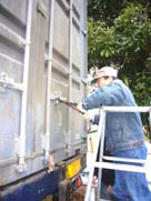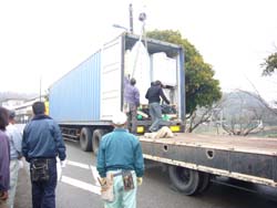 地球半周の長旅を終えた大型コンテナが、バックでゆっくりと建築場所に近づいてきました。