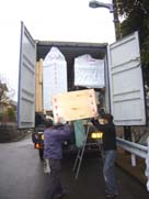 今回幸運だったのは、近隣の方々のご協力も頂いて、すぐ南側の道路がたっぷりと使えた事(左)。コンテナの帰った後には、おびただしい梱包の数。敷地の中にも重ね置きされています。