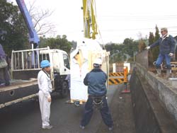 扉の直ぐ前にユニック車、そしてその後ろに25tクレーン。ユニックで少し引っ張り出して、後はクレーンで吊り上げる作戦です。