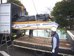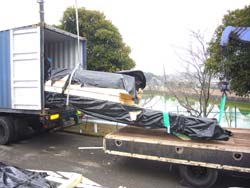 とにかく後ろから順番に、二列4〜5段に押し込まれた梱包を、一つずつ引いては吊り上げ、置き易い場所にひとまず置きます。