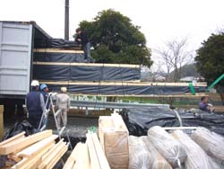 ここから梱包の移動が始まりました(左)。一番先に使うログの梱包をどこに置くか、施工中盤後半に使う物をどうするか・・。