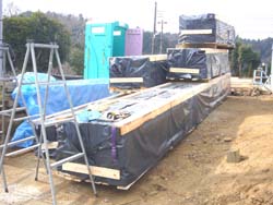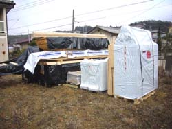 戸や窓の梱包は西側の空き地にひとまず置かせてもらい(右)、ログが組み上がった段階で組建て用クレーンを使って再度移動する事になりました。